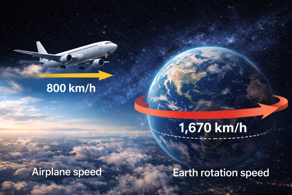 Fakta ini sering menimbulkan pertanyaan menarik. Jika Bumi berputar secepat itu, mengapa pesawat tidak perlu memperhitungkan rotasi planet ketika terbang dari satu kota ke kota lain. Secara intuitif, orang mungkin membayangkan bahwa landasan yang menjadi tujuan akan bergeser selama pesawat berada di udara.