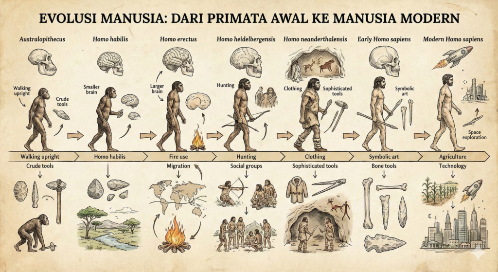Salah satu pertanyaan paling sering muncul dalam diskusi tentang evolusi adalah pernyataan, “Kalau manusia berasal dari kera, mengapa sampai sekarang kera masih ada?” Pertanyaan ini terdengar logis di permukaan, tetapi sebenarnya berangkat dari pemahaman yang keliru tentang apa yang dijelaskan oleh sains mengenai evolusi manusia. Kesalahpahaman ini telah bertahan lama karena cara evolusi disampaikan sering kali terlalu disederhanakan, baik melalui bahasa maupun visualisasi populer. Apa yang Sebenarnya Dikatakan Sains Menurut biologi evolusi, manusia tidak berasal dari kera modern seperti simpanse, gorila, atau orangutan yang hidup saat ini. Tidak ada teori ilmiah yang menyatakan bahwa kera modern berubah langsung menjadi manusia. Yang dijelaskan oleh sains adalah bahwa manusia dan kera modern memiliki nenek moyang yang sama, yaitu spesies primata purba yang hidup jutaan tahun lalu dan kini telah punah. Nenek moyang ini bukan manusia dan juga bukan kera modern, melainkan bentuk primata yang berbeda dari keduanya. Evolusi Bukan Garis Lurus Salah satu kesalahan terbesar dalam memahami evolusi adalah membayangkannya sebagai proses linier. Evolusi sering digambarkan seperti tangga, di mana satu spesies berubah total menjadi spesies lain dan kemudian menghilang. Dalam sains, evolusi justru dipahami sebagai proses bercabang, mirip dengan pohon yang memiliki satu batang utama dan banyak cabang. Setiap cabang mewakili garis keturunan yang berkembang dengan arah berbeda tergantung kondisi lingkungan dan tekanan seleksi yang dihadapi. Percabangan dari Nenek Moyang Bersama Sekitar enam hingga tujuh juta tahun lalu, menurut bukti fosil dan analisis genetika, terdapat satu populasi primata purba di Afrika yang menjadi nenek moyang bersama manusia dan kera besar modern. Populasi ini tidak hidup dalam satu lingkungan yang seragam. Sebagian hidup di hutan lebat, sementara sebagian lainnya berada di wilayah yang lebih terbuka akibat perubahan iklim dan kondisi geografis. Perbedaan lingkungan inilah yang mendorong terjadinya percabangan evolusi. Adaptasi yang Berbeda, Jalur yang Berbeda Primata yang hidup di hutan lebat mendapatkan keuntungan evolusioner jika memiliki kemampuan memanjat yang baik, lengan panjang, dan tubuh yang cocok untuk bergerak di pepohonan. Ciri-ciri ini diwariskan dan diperkuat dari generasi ke generasi, hingga menghasilkan kera besar modern seperti simpanse dan bonobo. Di sisi lain, primata yang hidup di area terbuka menghadapi tantangan berbeda, seperti kebutuhan berjalan jauh, membawa makanan, dan mengamati lingkungan sekitar dengan lebih luas. Awal Perkembangan Manusia Menurut Sains Dalam kondisi lingkungan terbuka, berjalan dengan dua kaki menjadi keuntungan biologis. Postur tubuh yang lebih tegak memungkinkan penggunaan tangan secara bebas dan meningkatkan efisiensi energi saat berjalan jauh. Individu dengan kemampuan ini cenderung lebih mampu bertahan hidup dan bereproduksi. Seiring waktu yang sangat panjang, ciri berjalan dua kaki semakin dominan dan menjadi salah satu karakter utama garis keturunan manusia menurut sains. Spesies Perantara dalam Sejarah Evolusi Proses evolusi manusia tidak melompat langsung dari primata purba ke manusia modern. Catatan fosil menunjukkan adanya banyak spesies perantara seperti Australopithecus, Homo habilis, dan Homo erectus. Spesies-spesies ini bukan manusia modern, tetapi juga bukan kera modern. Mereka merupakan cabang-cabang evolusi yang pernah ada, sebagian bertahan cukup lama, dan sebagian lainnya punah karena perubahan lingkungan atau persaingan dengan spesies lain. Mengapa Kera Masih Ada Hingga Sekarang Karena evolusi bersifat bercabang, tidak ada alasan ilmiah mengapa kera harus menghilang agar manusia bisa ada. Manusia dan kera modern berkembang di jalur yang berbeda setelah berpisah dari nenek moyang bersama. Hubungan ini lebih tepat digambarkan sebagai hubungan kekerabatan, bukan hubungan orang tua dan anak. Dalam kerangka ini, keberadaan kera modern justru sesuai dengan prediksi teori evolusi, bukan bertentangan dengannya. Peran Visualisasi dan Bahasa Populer Kesalahpahaman tentang evolusi banyak diperkuat oleh ilustrasi populer yang menggambarkan evolusi manusia sebagai barisan lurus dari kera membungkuk hingga manusia berdiri tegak. Visualisasi ini mudah dipahami, tetapi tidak mencerminkan kompleksitas evolusi yang sebenarnya. Selain itu, penggunaan bahasa seperti “manusia berasal dari kera” sering kali tidak presisi dan membuka ruang salah tafsir karena menghilangkan konsep nenek moyang bersama. Bukti Ilmiah yang Digunakan Sains Sains modern menjelaskan evolusi manusia berdasarkan berbagai jenis bukti, mulai dari fosil, anatomi perbandingan, hingga genetika. Kesamaan genetik yang tinggi antara manusia dan primata lain menunjukkan adanya kekerabatan evolusioner, bukan identitas yang sama. Perbedaan kecil dalam materi genetik dapat menghasilkan perbedaan besar dalam bentuk tubuh, kemampuan kognitif, dan perilaku, yang semuanya merupakan bagian dari proses evolusi jangka panjang. Navigasi pos Meteorit Hoba dan Anomali Kosmik di Permukaan Bumi Budak Penyebar Vanila